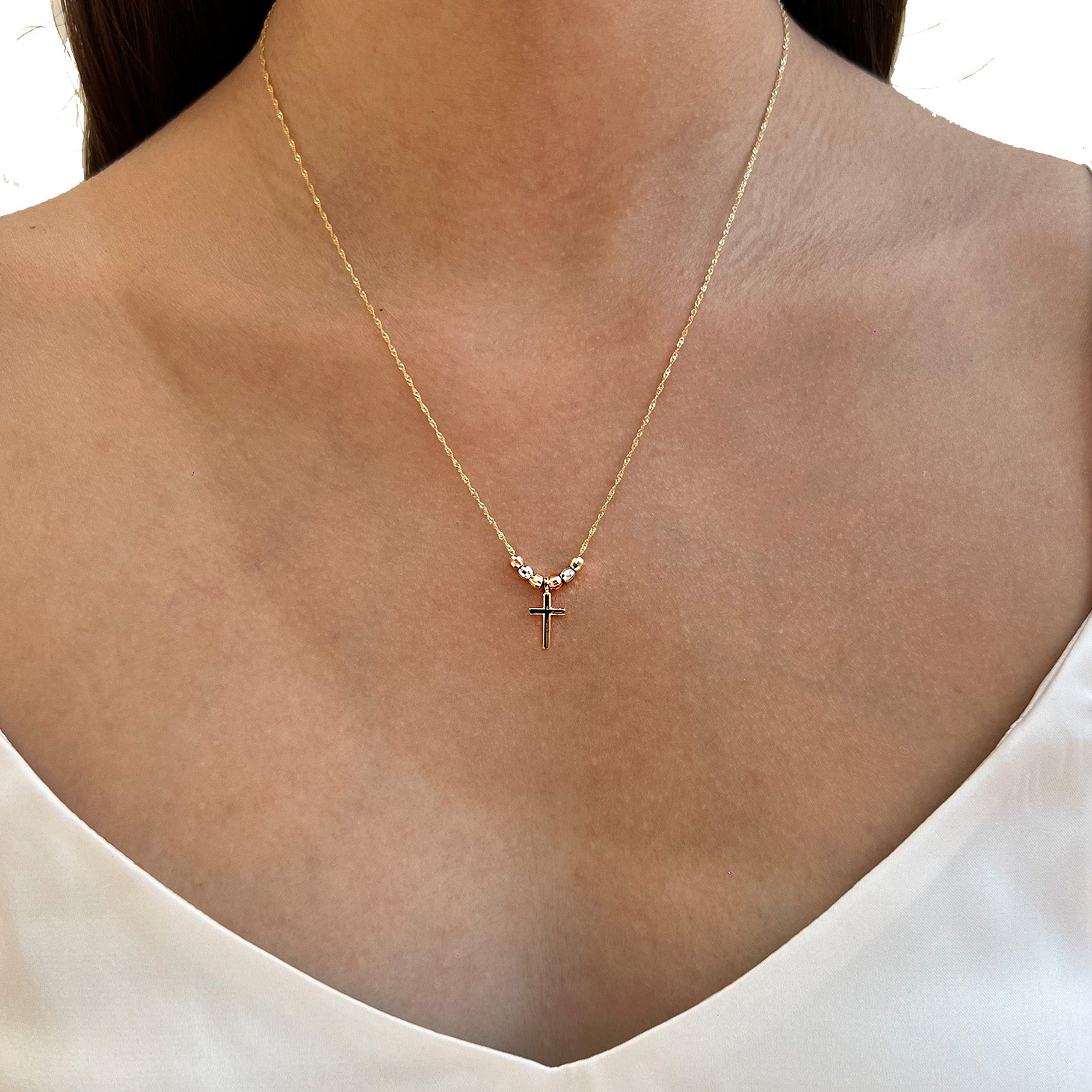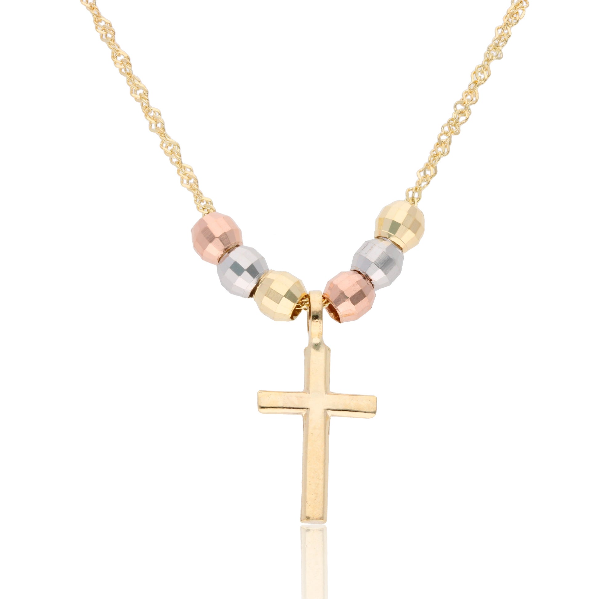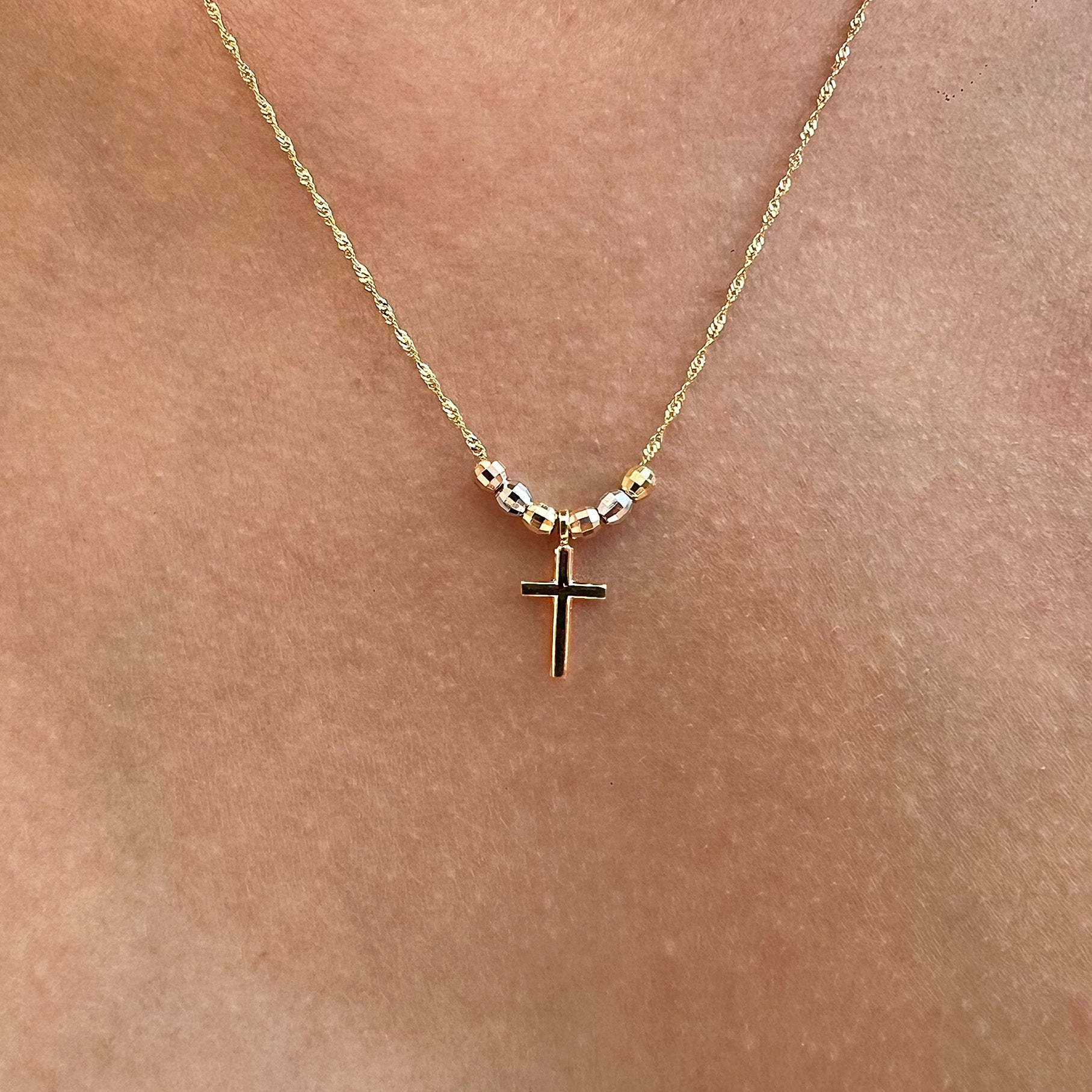 Hermoso collar de oro de 14 Kilates con dije de cruz y esferas facetadas de oro florentino.
