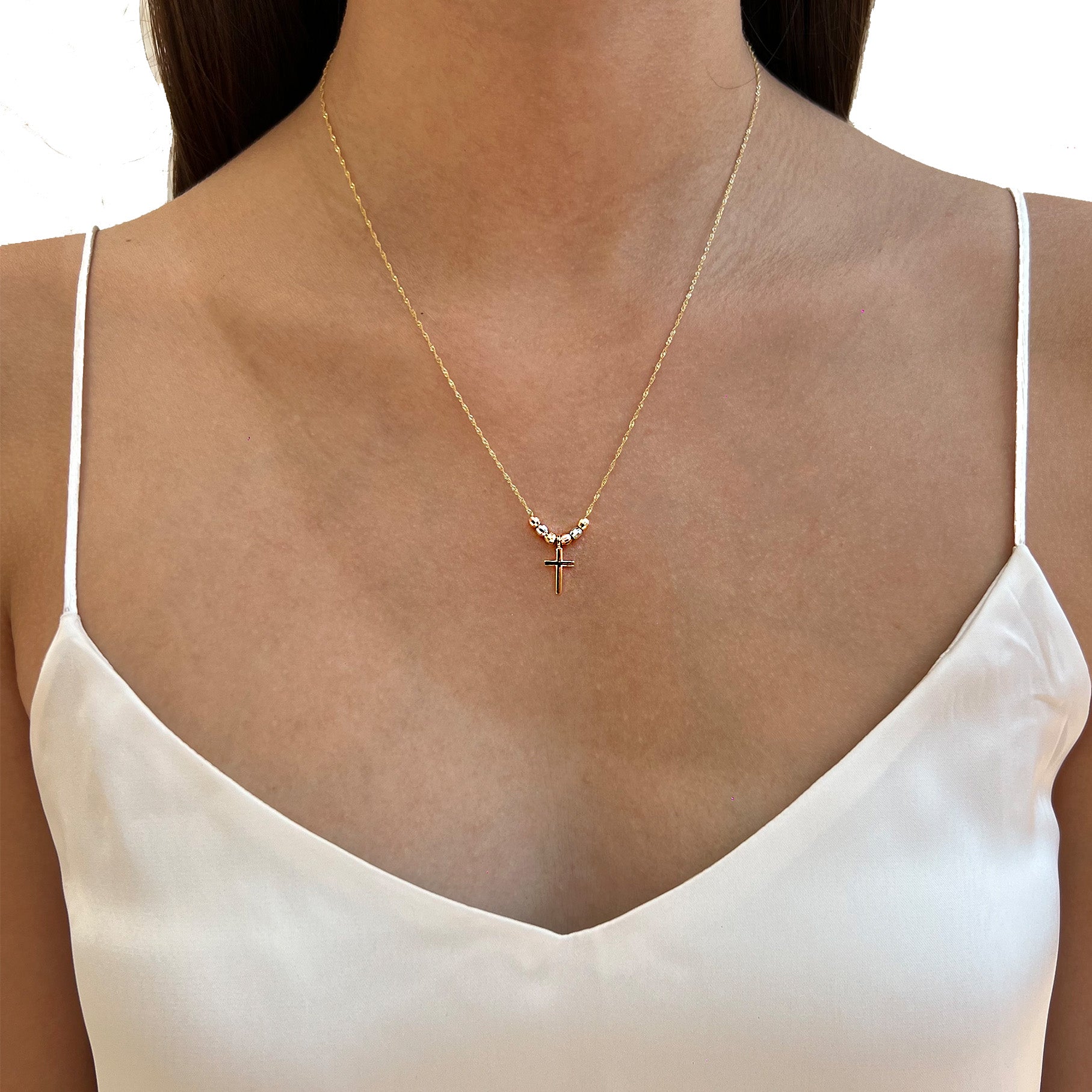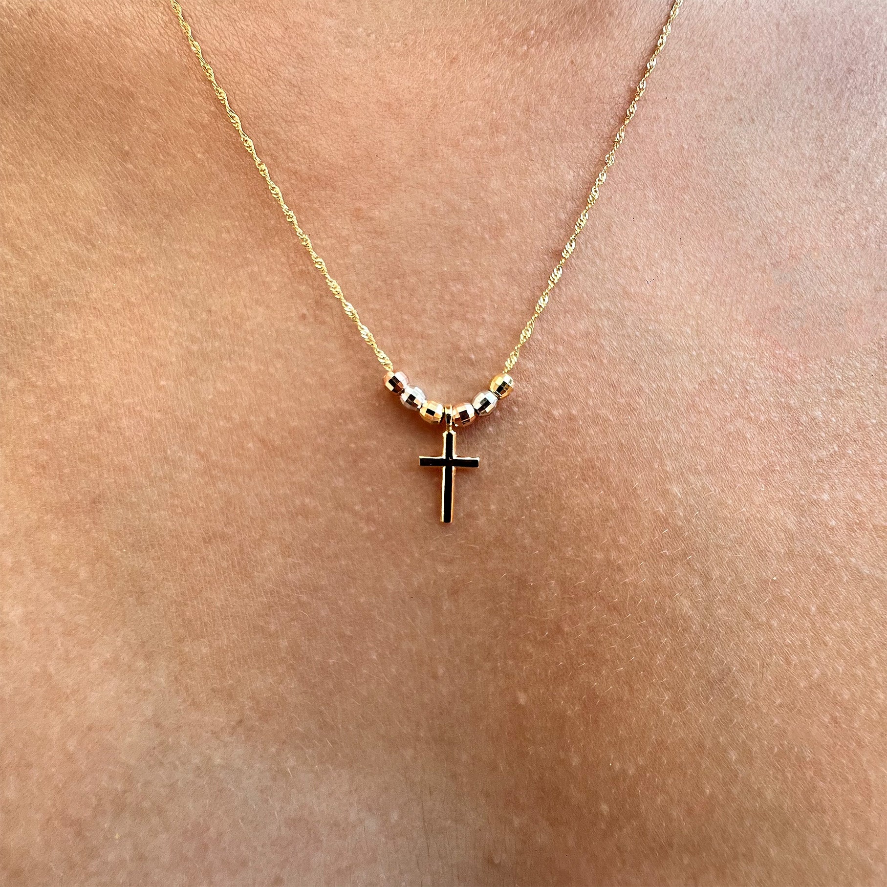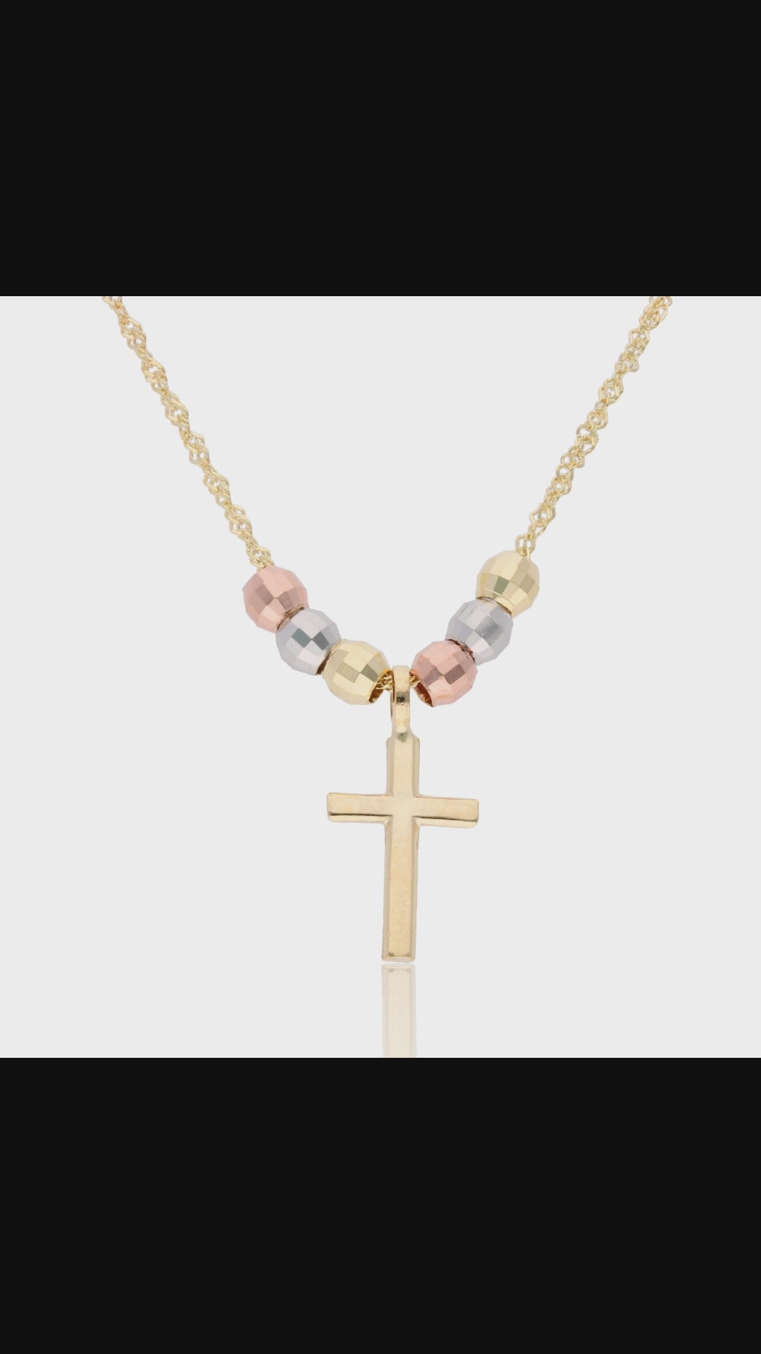 Hermoso collar de oro de 14 Kilates con dije de cruz y esferas facetadas de oro florentino.