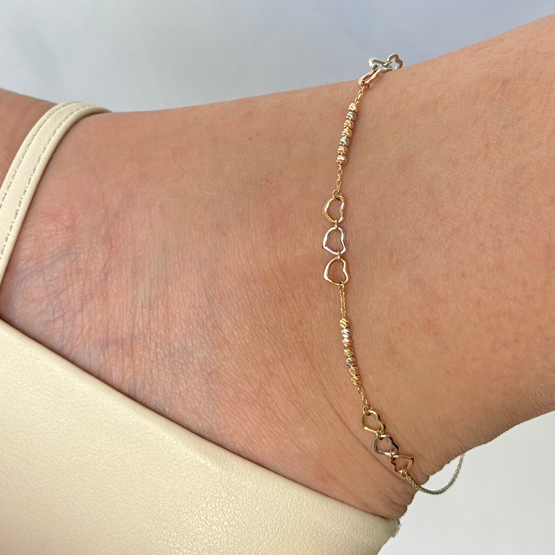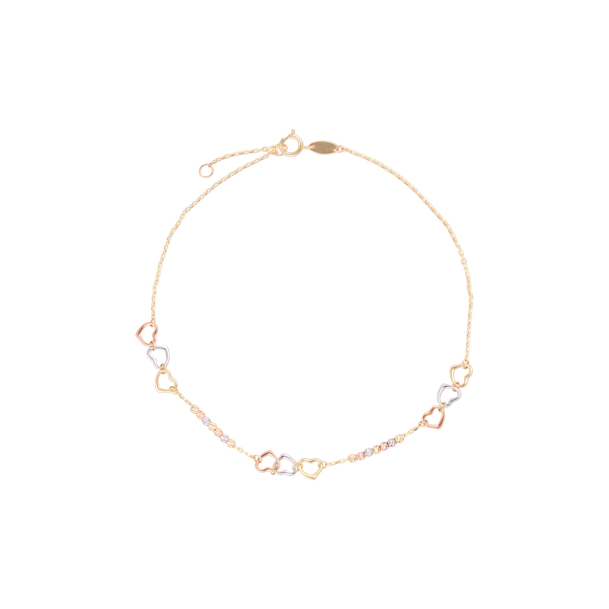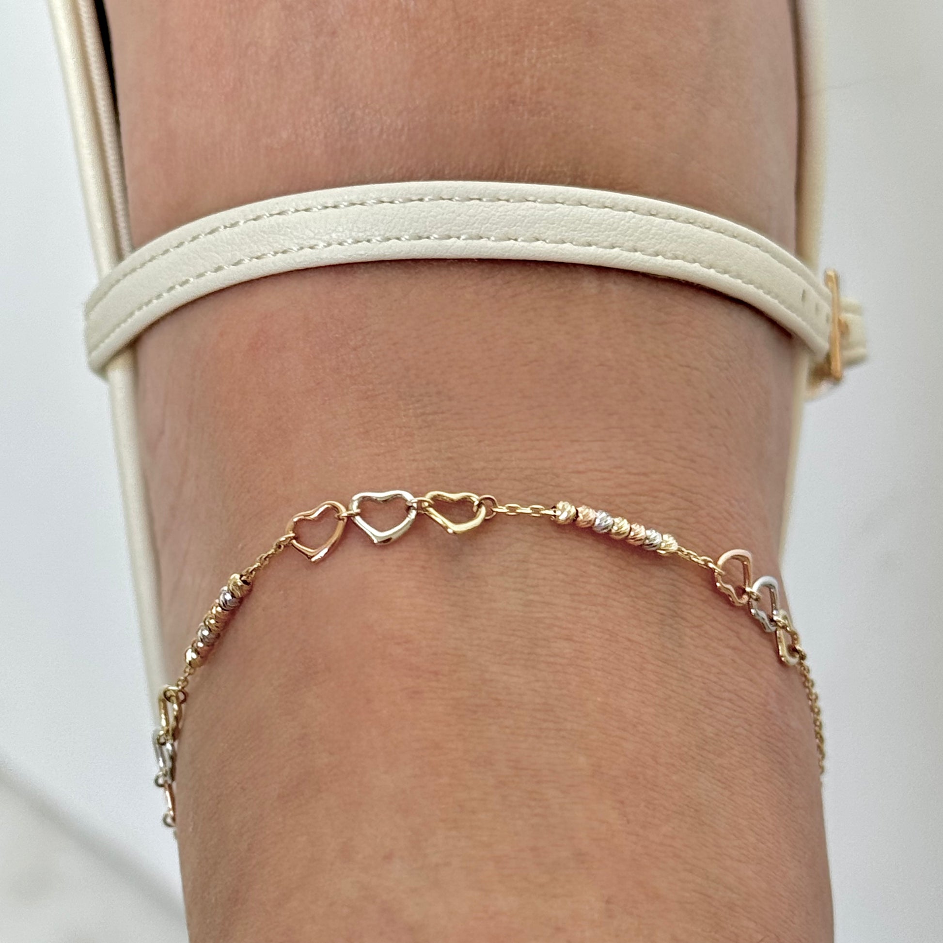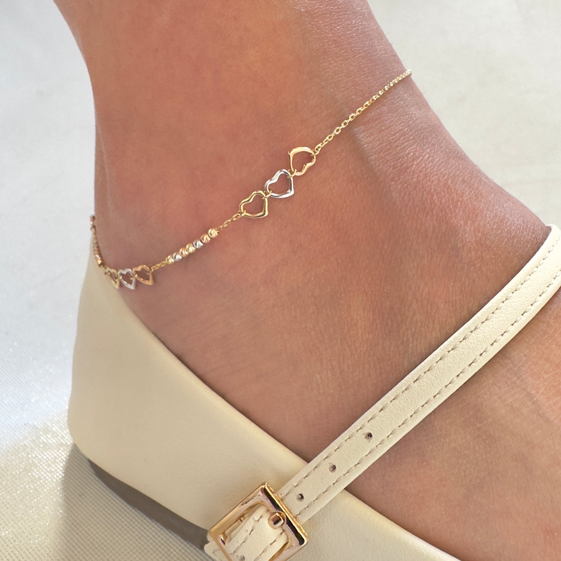 TOBILLERA ORO 14K KILATES DISEÑO 3 CORAZONES FLORENTINO 23 CM